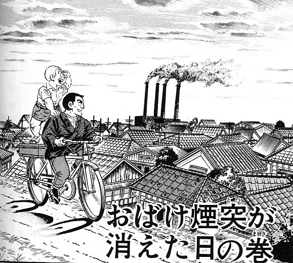 中から母親が「ほーら、あれがおばけ煙突だよ。今は2本あるけど、あれが3本、4本に見えてくるからね」と