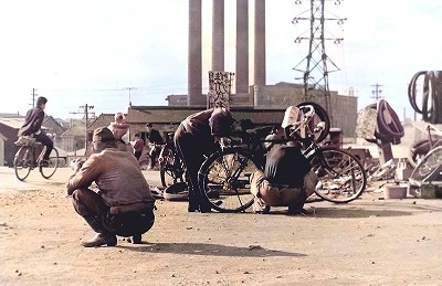 東京下町で「おばけ煙突」と呼ばれた発電所の巨大煙突。昭和19年夏、