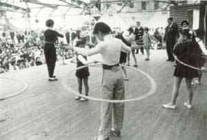 この年に大流行したおもちゃといえば、フラフープだそうだ。もとはオーストラリアの子どもたちの遊びにヒントを得てアメリカのおもちゃ会社が作って、この夏ニューヨークで大当たりし、日本では10月18日に270円で発売され爆発的ブームになった。ピーク時には2秒に1本が売れたというからそのすごさが理解できる。当時、お父さんたちは息子や娘のために会社を休んでデパートに買いに行ったそうだ。そして「やりすぎると腸捻転になる」といううわさが出たこともあり、約2ヶ月で急に下火になった。爆発的な人気モノほど飽きられることが多いのは、その後のアメリカンクラッカーやたまごっちなどにも該当する。しかしフラフープは今でも見かけるし、我が家の写真にもちゃっかりと写っていたりする。