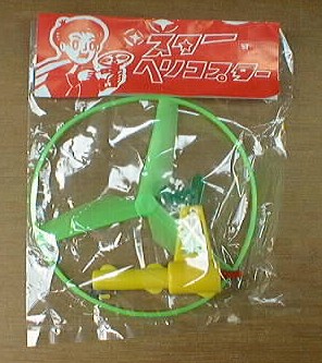 家の中でこいつを飛ばすと10秒くらい天井に張り付いたまま回転していた。ゴムでまき戻す仕組みなのだが、糸がからんでしまって使えなくなってしまう。または高く飛ばそうとせんがためについ強く糸をひいてしまい、切れることたびたび。