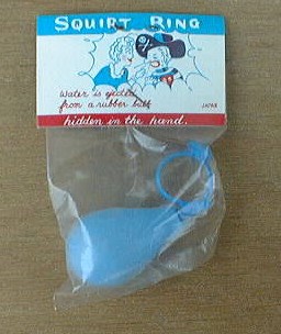容器の中に水を入れて、手のひらに隠す。「指輪を見せてあげようか」といいながらこぶしを握るとピュピュと相手の顔に水をひっかける駄おもちゃ。