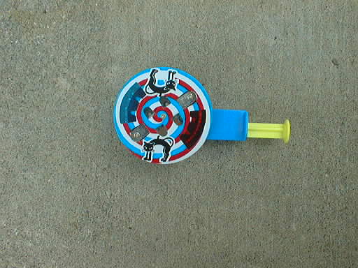 近所のお祭りの露店で売っていた。これまた知る人ぞ知るロングセラーの駄おもちゃ。注射器のようなピストンを押すことで、丸い鉄製の板が回転し、(100円ライターの)火花が出る石と接触し、パチパチと火花が飛び散る。板には青と赤のセロファンが貼ってあるので、花火のようにキレイ。当時は30円くらいだったと思うが、現在500円成りぃ〜。これってすぐに壊れてしまうんだ。