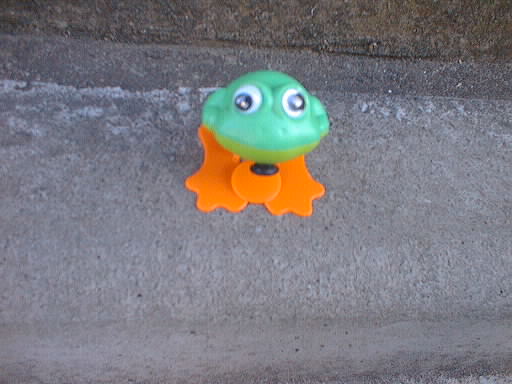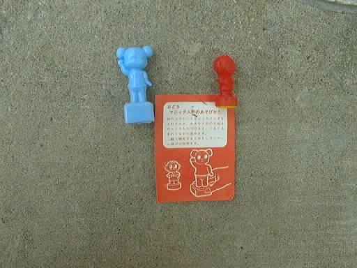 画像がきたないので、わかりずらいのだが、知る人ぞ知る駄おもちゃ。磁石の反発し合う力を応用したもので、一方の人形を近づけると、もう一方がクルクルと回転しながら進む。二人で競争しあうと楽しかった。どうやらこの人形は「悟空の大冒険」の悟空とカッコちゃんのようだ。(汗)
