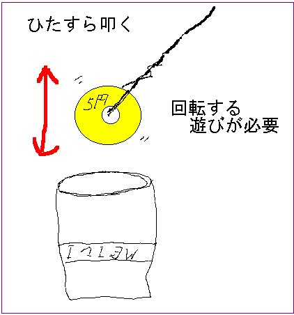 作業です。これをするには針金を5円玉に通し、コインが回転する