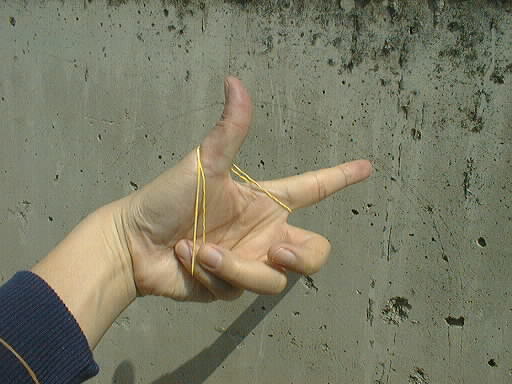 この場合、左手の人指しゆびの爪に輪ゴムをひっかけ、右手の方を放すことで発射する。
